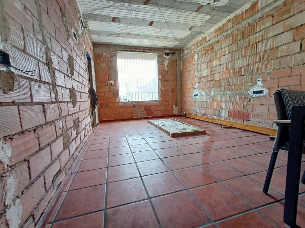 To the rear, a covered terrace leads to an existing, yet unfinished, extension project. This extension, accessible from the rear distributor, is planned to include a hallway, two double bedrooms, a bathroom, and a utility room.