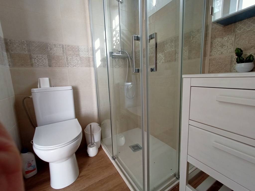 To the left of the hallway are two comfortable double bedrooms, each with air conditioning and access to the side porch. You’ll also discover a beautiful, well-equipped kitchen featuring solid wood furniture, ample storage, and a stylish marble countertop, with its own exit to the side porch.