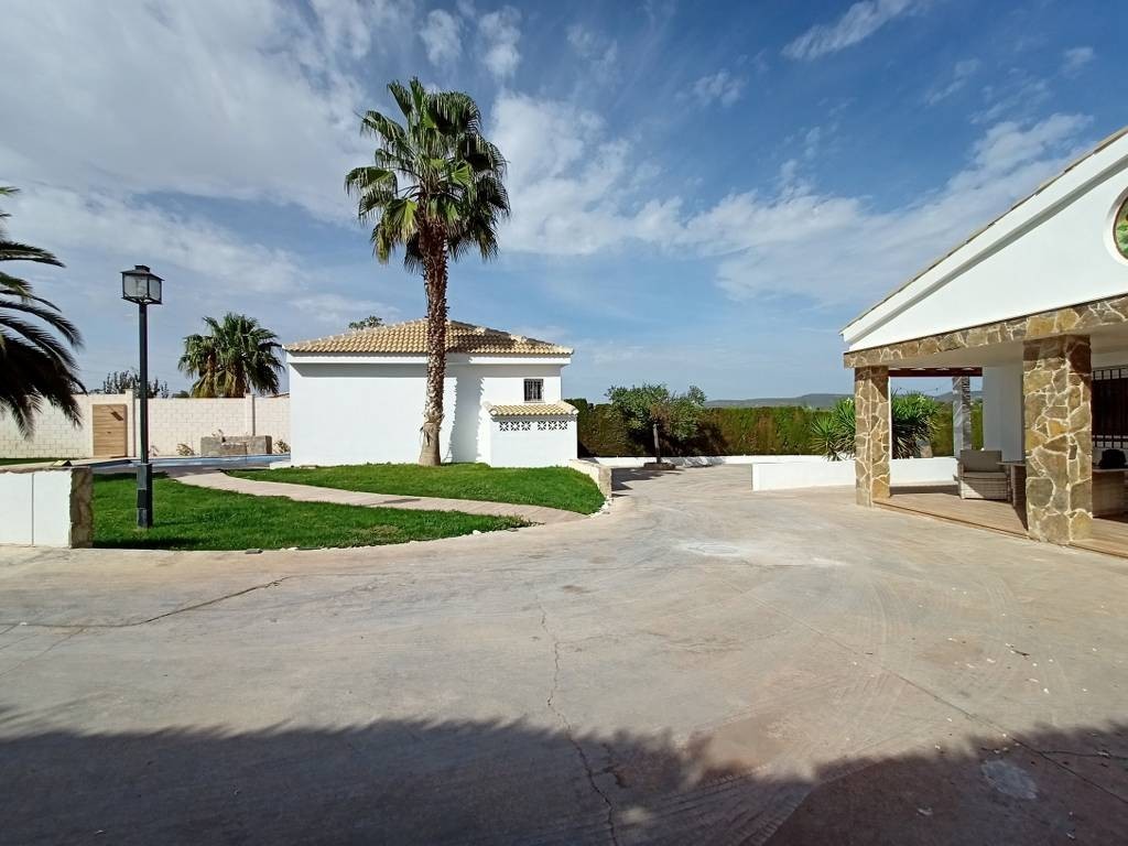 Access to the property is convenient via a short dirt track leading from the main road, where an electric gate provides secure entry. A concrete driveway guides you to the house’s entrance.